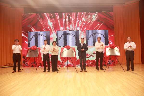 王愛(ài)武、汪時(shí)珍、畢明生及三個(gè)產(chǎn)業(yè)學(xué)院院長(zhǎng)為產(chǎn)業(yè)學(xué)院揭牌。