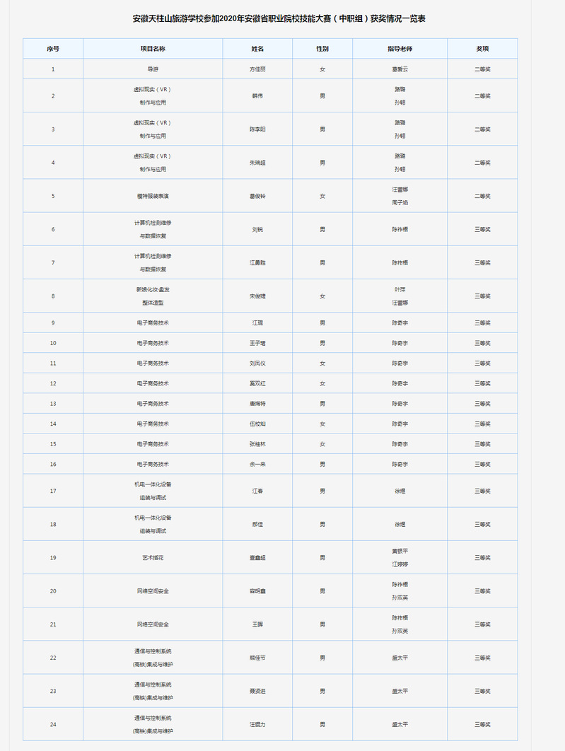 近日,2020年安徽省職業(yè)院校技能大賽(中職組)成績公布,安徽天柱山旅游學(xué)校再創(chuàng)佳績,榮獲3個二等獎,8個三等獎,共有24名學(xué)生獲獎。