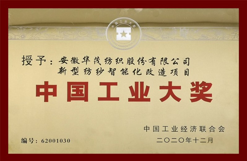 12月27日上午,從北京召開的第六屆中國工業(yè)大獎(jiǎng)發(fā)布會(huì)上傳來喜訊,由安徽華茂申報(bào)的新型紡紗智能化改造項(xiàng)目榮獲“中國工業(yè)大獎(jiǎng)”。中國工業(yè)大獎(jiǎng)是我國工業(yè)領(lǐng)域最高獎(jiǎng)項(xiàng),獎(jiǎng)項(xiàng)的獲得是對安徽華茂在以制造強(qiáng)國為己任、以產(chǎn)業(yè)報(bào)國為初心,堅(jiān)持自立自強(qiáng),走中國特色創(chuàng)新發(fā)展、綠色發(fā)展新型工業(yè)化道路等方面做出突出成績的充分肯定。