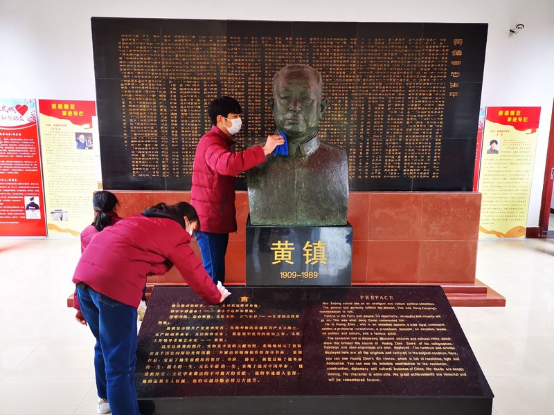 參觀結(jié)束后,同學(xué)們拿起勞動工具,自發(fā)的打掃陳列館的衛(wèi)生?!拔以诓潦命S鎮(zhèn)爺爺?shù)乃芟駮r(shí),覺得黃鎮(zhèn)爺爺在注視著我,他勉勵我要爭做時(shí)代雷鋒?!眲⒖X同學(xué)如是說。