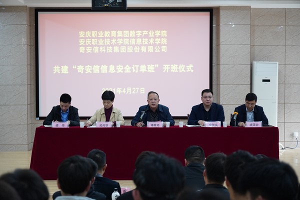 4月27日下午,由安慶職教集團(tuán)數(shù)字產(chǎn)業(yè)學(xué)院、安慶職業(yè)技術(shù)學(xué)院信息技術(shù)學(xué)院與奇安信科技集團(tuán)股份有限公司合作共建的數(shù)字產(chǎn)業(yè)學(xué)院首屆“奇安信信息安全訂單班”開班典禮在2號(hào)教學(xué)樓216教室隆重舉行。