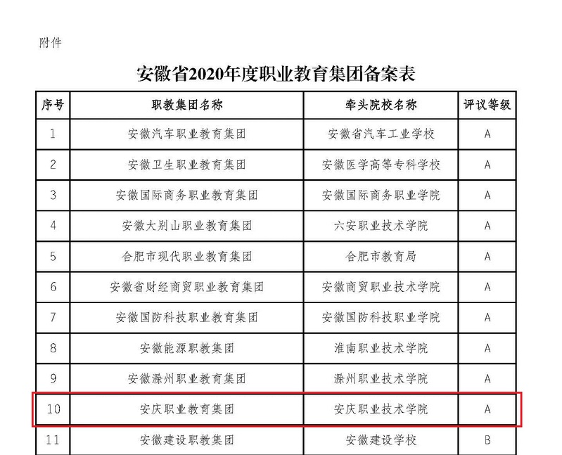 9月8日 ,安徽省教育廳公布了全省47個(gè)職業(yè)教育集團(tuán)2020年度工作備案的結(jié)果,安慶職業(yè)教育集團(tuán)再度獲得A等級(jí)。