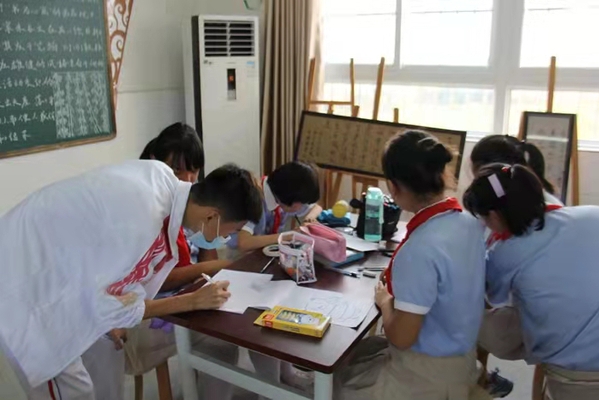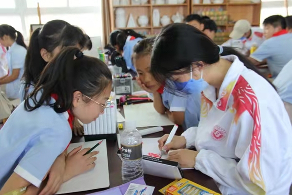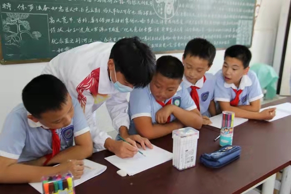 項目組一行在老峰鎮(zhèn)中心學校召開座談會,儲可可介紹了項目組成員、項目開展情況以及此次活動的方案、預期要達到的效果等。老峰鎮(zhèn)中心學校沈良順校長簡要介紹了老峰鎮(zhèn)中心學校校史、美術體育課程開設情況等。隨后,安慶職業(yè)技術學院藝術俱樂部部分優(yōu)秀學生深入課堂,給五、六年級學生開展繪畫、藝術體操等教學活動。
