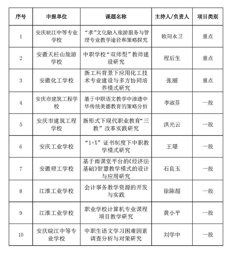 根據(jù)《安慶職業(yè)教育集團(tuán)關(guān)于做好2020年教學(xué)改革研究課題中期檢查及2021年教學(xué)改革研究課題申報工作的通知》文件精神,經(jīng)個人申報、學(xué)校推薦,集團(tuán)秘書處按照相關(guān)程序組織形式審查、專家評審,現(xiàn)對集團(tuán)2021年教學(xué)改革研究課題擬立項(xiàng)名單進(jìn)行公示。