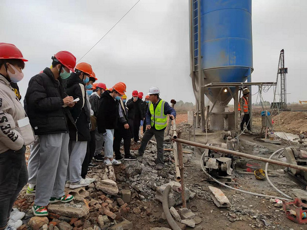 兩個(gè)施工項(xiàng)目分別由中鐵十七局與中鐵十六局承建。項(xiàng)目涵蓋了水泥攪拌樁地基加固、路基施工(土工格柵)、明挖法、隧道臺(tái)階開挖法、隧道模板襯砌等施工工藝。每個(gè)項(xiàng)目現(xiàn)場(chǎng),由項(xiàng)目部工程師分組給同學(xué)們講解各施工流程的技術(shù)要點(diǎn),并且對(duì)同學(xué)們提出的問(wèn)題給與現(xiàn)場(chǎng)解答。
