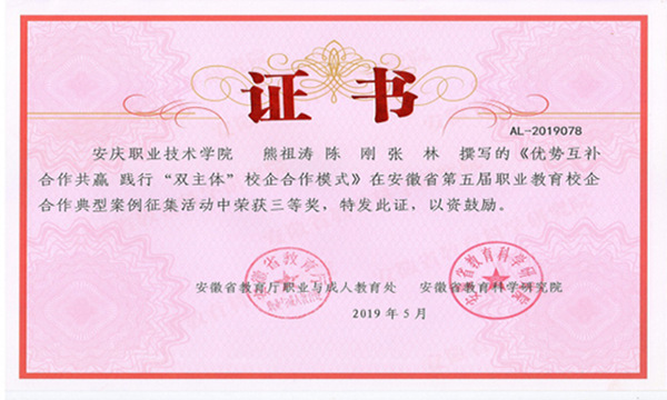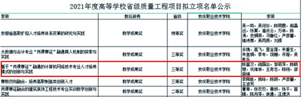合作4年來(lái),校企聯(lián)合開(kāi)發(fā)基于工作過(guò)程項(xiàng)目化教材9種,并正式出版發(fā)行,推進(jìn)了校企合作專業(yè)教學(xué)內(nèi)容創(chuàng)新;雙方共同申報(bào)的“優(yōu)勢(shì)互補(bǔ)合作共贏踐行‘雙主體’校企合作模式”在安徽省第五屆校企合作典型案例征集活動(dòng)中榮獲三等獎(jiǎng);通過(guò)校企聯(lián)合委派指導(dǎo)教師輔導(dǎo)學(xué)生參加各類職業(yè)技能大賽,榮獲安徽省職業(yè)技能大賽一等獎(jiǎng)2項(xiàng),二等獎(jiǎng)3項(xiàng),三等獎(jiǎng)8項(xiàng)的好成績(jī);為進(jìn)一步深化學(xué)生德育教育,2019年校企雙方黨組織共建“思政實(shí)踐教育基地”在學(xué)生的素質(zhì)教育方面獲得多方認(rèn)可;在2021年度安慶職業(yè)技術(shù)學(xué)院優(yōu)秀人才培養(yǎng)方案評(píng)選中,校企共建計(jì)算機(jī)網(wǎng)絡(luò)技術(shù)專業(yè)人才培養(yǎng)方案獲得一等獎(jiǎng);雙方共同研究的“基于‘崗課賽證’融通的計(jì)算機(jī)網(wǎng)絡(luò)技術(shù)專業(yè)人才模式的創(chuàng)新與實(shí)踐”榮獲安徽省教學(xué)成果獎(jiǎng)三等獎(jiǎng)。一項(xiàng)項(xiàng)獎(jiǎng)牌,一項(xiàng)項(xiàng)榮譽(yù),一項(xiàng)項(xiàng)成果充分體現(xiàn)了校企合作成果,推進(jìn)了職業(yè)教育創(chuàng)新發(fā)展步伐。(文、圖:陳 剛 審核:疏國(guó)會(huì))