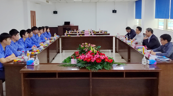 簽約儀式后,畢明生校長(zhǎng)一行與學(xué)校在環(huán)新集團(tuán)工作、實(shí)習(xí)的學(xué)生代表舉行了座談會(huì)。座談會(huì)上,畢明生親切詢問了大家在企的工作崗位、工作強(qiáng)度等情況,在得到學(xué)生們對(duì)企業(yè)提供的收入待遇、工作環(huán)境、住宿飲食均表示滿意的反饋后,他非常高興。他表示,安慶職院辦學(xué)始終堅(jiān)持遴選優(yōu)質(zhì)企業(yè)開展深度校企合作,就是要以高質(zhì)量就業(yè)為導(dǎo)向,創(chuàng)新人才培養(yǎng)模式,保證同學(xué)們從入校就按照學(xué)校與企業(yè)共同制定的人才培養(yǎng)方案愉快學(xué)習(xí),實(shí)習(xí)、畢業(yè)就能夠進(jìn)入優(yōu)質(zhì)企業(yè)高質(zhì)量就業(yè)。座談會(huì)上同學(xué)們表現(xiàn)出來的積極昂然的精神面貌,熱烈暢談的今后發(fā)展目標(biāo)方向,讓大家深受感染。他鼓勵(lì)同學(xué)們要常懷感恩之心,感恩時(shí)代、家庭、企業(yè)、學(xué)校,保持良好情緒才能全身心積極投身工作;要時(shí)刻腳踏實(shí)地,持續(xù)提升技術(shù)技能能力才能擁有更堅(jiān)實(shí)的發(fā)展基礎(chǔ);要明確目標(biāo)方向,明晰個(gè)人職業(yè)生涯發(fā)展規(guī)劃才能獲取更廣闊發(fā)展空間;要守護(hù)健康幸福,堅(jiān)持體育運(yùn)動(dòng)、堅(jiān)持健康的生活方式,為自己今后的事業(yè)、家庭進(jìn)行儲(chǔ)備。他最后表示,同學(xué)們的發(fā)展前景和成果就是學(xué)校辦學(xué)的品牌,母校永遠(yuǎn)是你們最堅(jiān)強(qiáng)的后盾,是你們永遠(yuǎn)的家!
