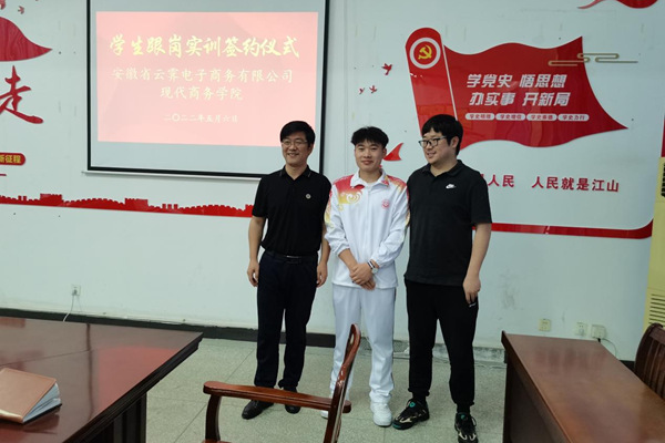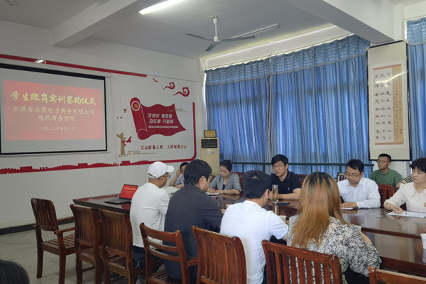 5月6日上午,安慶職業(yè)技術(shù)學(xué)院現(xiàn)代商務(wù)學(xué)院在3號教學(xué)樓510會議室,與安徽省云霽電子商務(wù)有限公司隆重舉辦20級電子商務(wù)專業(yè)學(xué)生跟崗實習(xí)簽約儀式,標(biāo)志著學(xué)院在校企合作和教學(xué)改革開啟了新篇章。現(xiàn)代商務(wù)學(xué)院黨總支班子成員、電子商務(wù)專業(yè)教師代表、輔導(dǎo)員及10名學(xué)生代表出席儀式,云霽電商公司總經(jīng)理程賽超一行四人出席了簽約儀式。