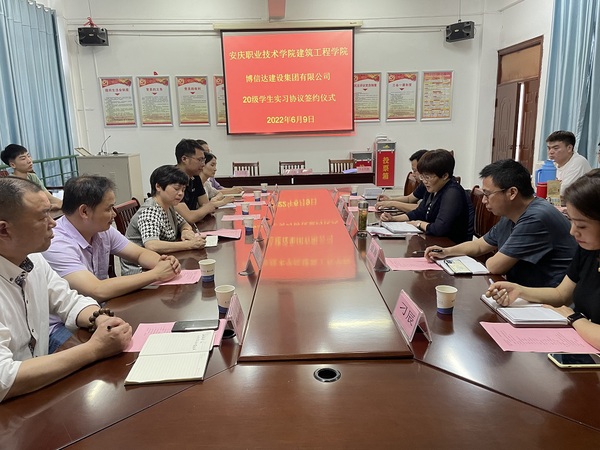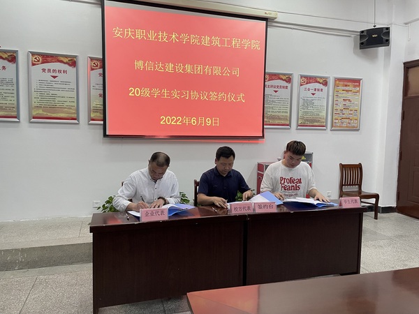 6月9日下午,安慶職業(yè)技術(shù)學(xué)院建筑工程學(xué)院與博信達(dá)建設(shè)集團(tuán)有限公司關(guān)于20級(jí)學(xué)生實(shí)習(xí)協(xié)議簽約儀式隆重舉行,博信達(dá)建設(shè)集團(tuán)有限公司總經(jīng)理張羽、建筑工程學(xué)院院長(zhǎng)陳月萍及校企雙方部門(mén)負(fù)責(zé)人出席了儀式,該院黨總支副書(shū)記葉彤主持儀式,2020級(jí)實(shí)習(xí)學(xué)生代表參加了儀式。