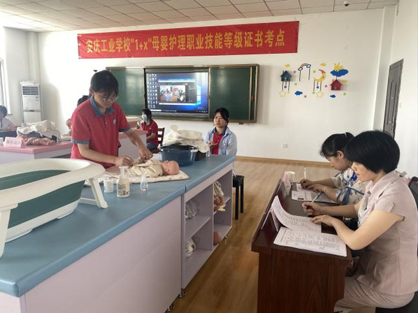 2022年6月11日上午教育部1+X母嬰護(hù)理職業(yè)技能等級證書考試在安慶專業(yè)學(xué)校實(shí)訓(xùn)樓舉行。本次考試由教育部認(rèn)證的第三方機(jī)構(gòu)——山東陽光大姐服務(wù)有限公司考評站與工業(yè)學(xué)校共同負(fù)責(zé)實(shí)施,圓滿完成了 36名學(xué)前教育專業(yè)在校學(xué)生的考證工作??紕?wù)安排井然有序,得到了考評領(lǐng)導(dǎo)和專家的一致好評。