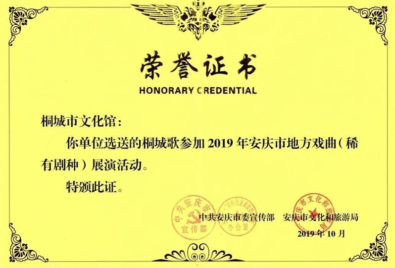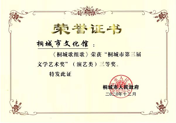 市文化館攜手中華職校開展豐富的“桐城歌”傳承傳習(xí)活動,組織業(yè)務(wù)人員對學(xué)生們的聲腔、方言、舞蹈動作進(jìn)行專業(yè)系統(tǒng)培訓(xùn),演繹富有鄉(xiāng)土氣息的桐城歌音樂作品《桐城歌組歌》。2019年10月作品入選參加由中共安慶市委宣傳部、安慶市文化和旅游局舉辦的2019年安慶市地方戲曲(稀有劇種)展演活動,獲得一致好評;2020年12月作品獲桐城市人民政府頒發(fā)的“第三屆文學(xué)藝術(shù)獎”(演藝類)三等獎。