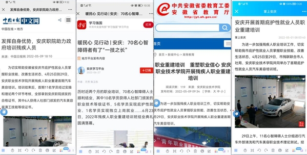 安慶職院作為省、市兩級殘疾人技能培訓(xùn)基地,一直以高度社會責(zé)任感開展殘疾人職業(yè)技能培訓(xùn),致力于服務(wù)好每一位社會殘障人士。幫助他們掌握了一定的職業(yè)技能,增強(qiáng)他們熱愛生活、融入社會的信心,用熱情給大量殘疾人家庭帶來了活力與希望。開展“殘疾人職業(yè)重建”培訓(xùn)項目以來,面向安慶市心智障礙人士提供了諸如面點(diǎn)、插花、烘焙、汽車美容、短視頻制作等技能培訓(xùn),還針對他們自卑、焦躁等負(fù)面情緒,開設(shè)了藝術(shù)調(diào)理類等心理輔導(dǎo)課程,幫助他們調(diào)節(jié)身心。僅今年上半年就有11名學(xué)員通過汽車美容和烘焙技能考核,獲得人社部門頒發(fā)的職業(yè)資格證書,并推薦到愛心企業(yè)實現(xiàn)就業(yè)。先后被中國日報、學(xué)習(xí)強(qiáng)國、安徽省教育廳、安徽省殘聯(lián)等單位報道。