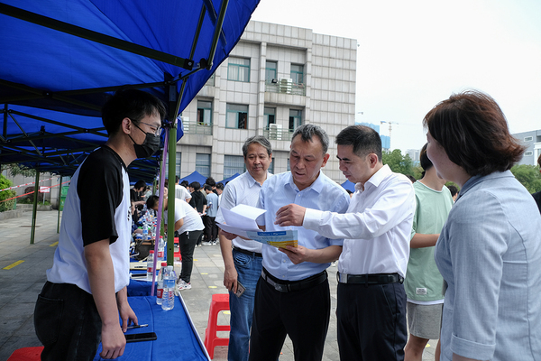 校黨委書記童宏葵、黨委副書記李克讓、安慶市人力資源和社會保障局副局長方敏、市公共就業(yè)創(chuàng)業(yè)服務中心主任王中群,到雙選會現(xiàn)場指導,了解學生們的求職意向和企業(yè)的用工需求。