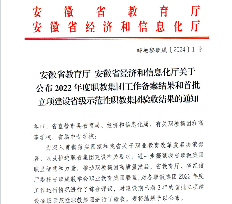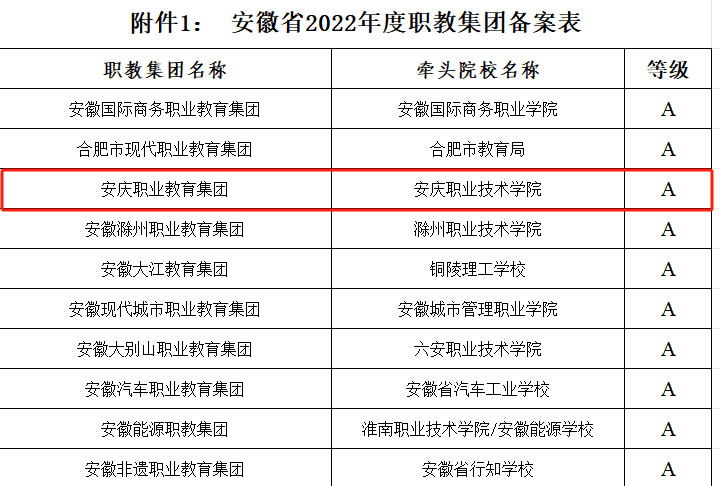 近日,安徽省教育廳、安徽省經(jīng)濟和信息化廳共同發(fā)出通報文件,安慶職教集團在全省57家職教集團2022年度工作運行情況綜合評價中,以總分第三名成績獲評安徽省A類職教集團,實現(xiàn)連續(xù)五年榮獲安徽省A類職教集團榮譽。