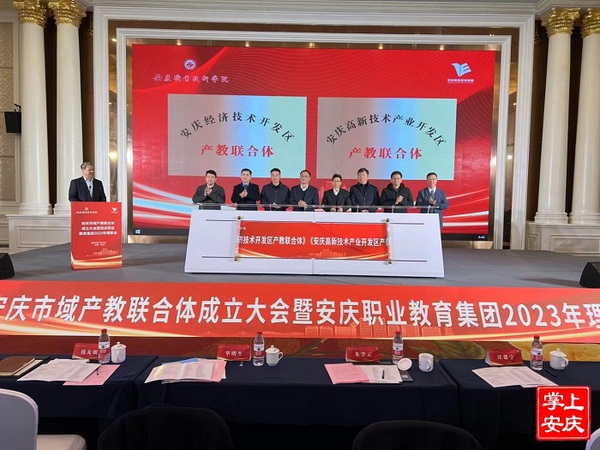 為切實(shí)強(qiáng)化產(chǎn)教深度融合載體建設(shè),促進(jìn)教育鏈與產(chǎn)業(yè)鏈有機(jī)銜接,精準(zhǔn)提升服務(wù)我市產(chǎn)業(yè)發(fā)展能力,1月31日上午,安慶市域產(chǎn)教聯(lián)合體成立大會暨安慶職業(yè)教育集團(tuán)2023年理事會在安慶碧桂園鳳凰大酒店隆重召開。安慶市人民政府副秘書長朱學(xué)云,安慶職業(yè)技術(shù)學(xué)院校長、安慶職教集團(tuán)理事長畢明生,安慶市教育體育工委副書記張復(fù)雙,安慶市人力資源和社會保障局副局長方敏,安慶經(jīng)濟(jì)技術(shù)開發(fā)區(qū)黨工委副書記汪建寧,安慶高新技術(shù)產(chǎn)業(yè)開發(fā)區(qū)管委會副主任錢友明,安徽環(huán)新集團(tuán)股份有限公司黨委副書記、副總經(jīng)理蔡向東,安徽曙光化工集團(tuán)有限公司總經(jīng)理沈少培出席大會并為安慶經(jīng)濟(jì)技術(shù)開發(fā)區(qū)產(chǎn)教聯(lián)合體和安慶高新技術(shù)產(chǎn)業(yè)開發(fā)區(qū)產(chǎn)教聯(lián)合體揭牌。市教體局、人社局、總工會、發(fā)改委、科技局、經(jīng)信局、財(cái)政局、農(nóng)業(yè)農(nóng)村局、商務(wù)局、退役軍人事務(wù)局等安慶市域產(chǎn)教聯(lián)合體指導(dǎo)委員會單位,安慶師范大學(xué)、北京化工大學(xué)安慶研究所、安慶市汽車工業(yè)協(xié)會等院校、科研機(jī)構(gòu)和行業(yè)協(xié)會,市人才發(fā)展集團(tuán)和市經(jīng)開區(qū)、高新區(qū)骨干企業(yè)120余位代表出席大會。安慶職業(yè)技術(shù)學(xué)院黨委副書記,安慶職教集團(tuán)秘書長李克讓主持大會。