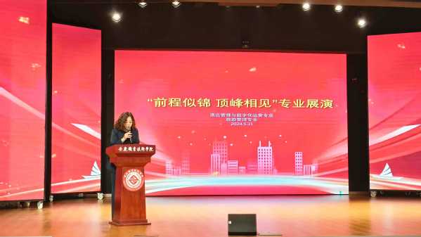管理服務學院院長陳穎致辭,代表學院師生感謝蒞臨活動現場的企業(yè)來賓、學校相關部門等對管理服務學院專業(yè)建設、實習就業(yè)、學生成長成才等各項工作的熱忱關心和大力支持;寄語即將走上實習就業(yè)工作崗位的2022級旅游酒店專業(yè)同學,要求大家樹立正確的擇業(yè)觀和就業(yè)觀,積極轉變身份角色,盡早樹立職場意識;堅定信念遵守職業(yè)道德,勇敢追求人生理想;深入了解安慶歷史人文、熟悉安慶產業(yè)企業(yè)、關心安慶建設發(fā)展,以實際行動助力美好安慶建設;同時對2023級同學提出殷切希望,要求大一同學在校期間努力學好專業(yè)理論知識、積極提升專業(yè)操作技能、全面豐富人文道德素養(yǎng),真正踐行“勤學篤行德技雙馨”的校訓精神。安慶會展中心會議中心酒店總經理丁敏代表企業(yè)發(fā)言,她指出未來的企業(yè)競爭是人才的競爭,學習能力和專業(yè)技能是高職同學們成功的核心競爭力,希望同學們不斷更新知識、提高綜合素養(yǎng),志存高遠腳踏實地,勇往直前未來可期。