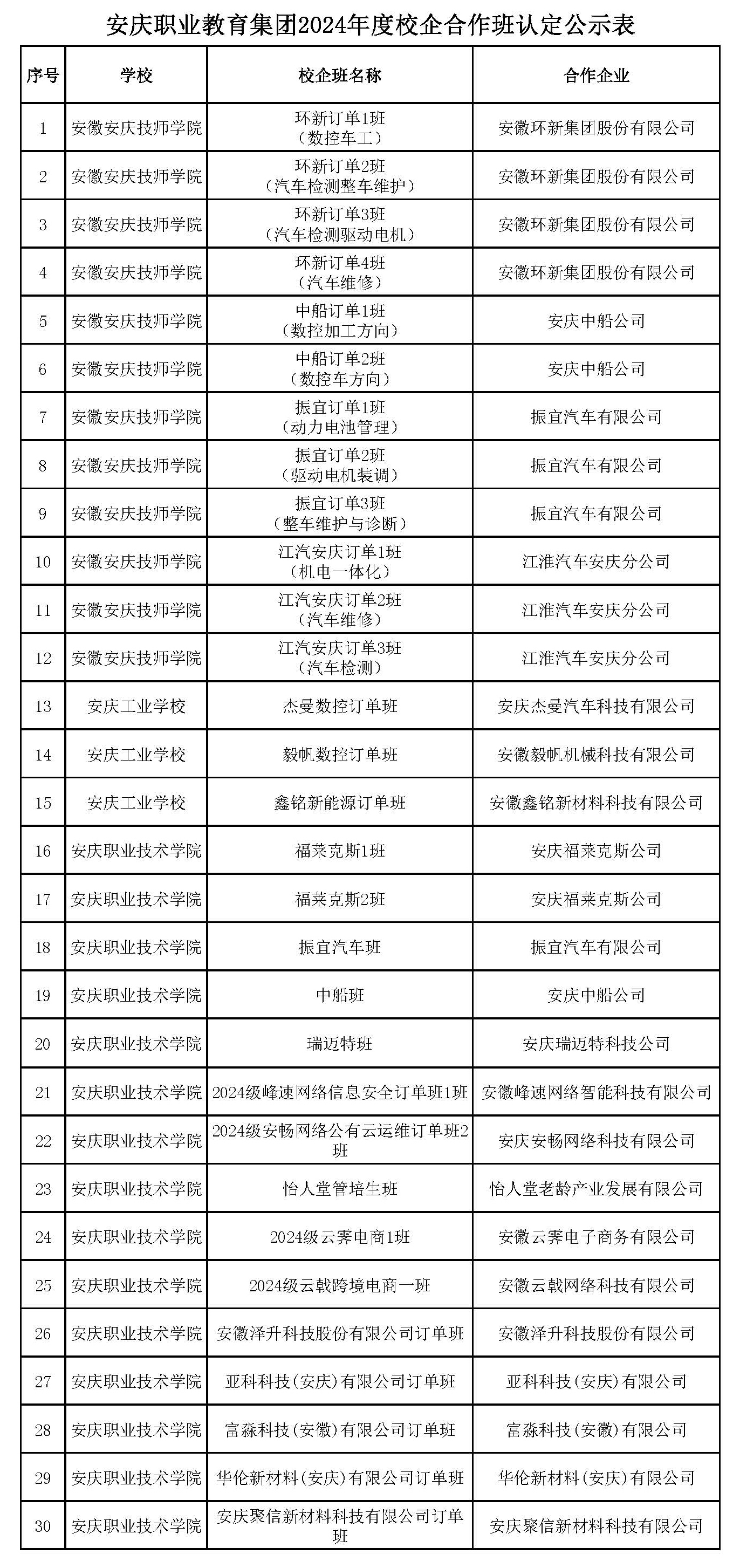 根據(jù)《關(guān)于報送招生、校企合作班項目獎補資金申報材料的通知》(安職集團〔2024〕4號)等相關(guān)文件要求,集團秘書處組織開展了2024年度招生、省級市域產(chǎn)教聯(lián)合體、校企合作班項目評審工作,制定出臺《安慶職業(yè)教育集團2024年度招生、省級市域產(chǎn)教聯(lián)合體、校企合作班評審工作實施方案》,成立評審工作領(lǐng)導(dǎo)小組,設(shè)立評委會,遴選評審專家,并嚴格按照《關(guān)于印發(fā)〈安慶職業(yè)教育集團財政獎補資金認定管理辦法〉的通知》(教體高〔2024〕185號)文件對各校提供的項目申報材料進行了評審,認定結(jié)果現(xiàn)予公示。