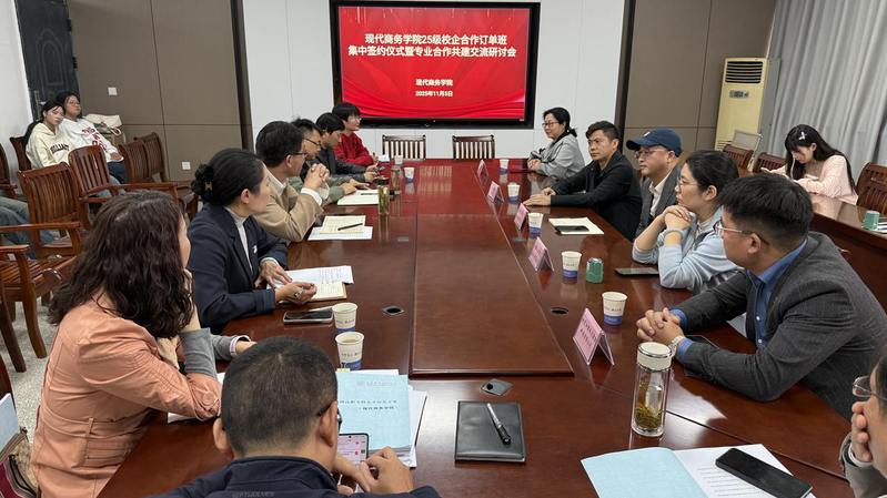 11月5日,安慶職業(yè)技術(shù)學(xué)院現(xiàn)代商務(wù)學(xué)院在3號教學(xué)樓510會議室舉行校企合作訂單班集中簽約儀式,來自安慶本地的安徽云霽電子商務(wù)有限公司、安徽星虹信息技術(shù)有限公司、安徽源潭柯林沃德刷業(yè)科技有限公司、安徽際通物流有限公司、安慶和君縱達(dá)數(shù)據(jù)科技有限公司五家企業(yè)相關(guān)負(fù)責(zé)人齊聚一堂,共同簽約并交流?,F(xiàn)代商務(wù)學(xué)院院長金啟勝出席儀式,該院教學(xué)工作負(fù)責(zé)人、學(xué)生工作負(fù)責(zé)人、專業(yè)負(fù)責(zé)人、訂單班輔導(dǎo)員以及訂單班學(xué)生代表參加活動。