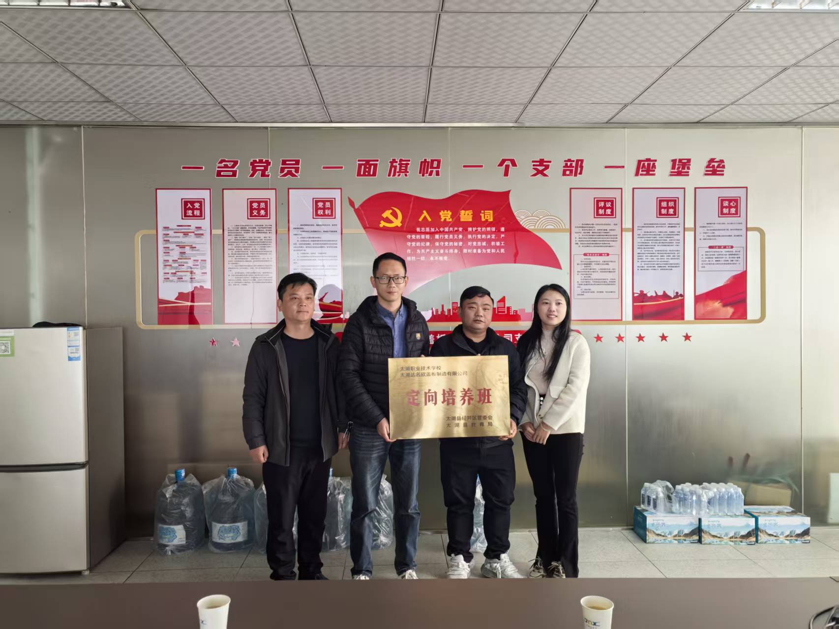 11月26日,太湖職業(yè)技術(shù)學(xué)校與太湖達(dá)名欣蓋板制造有限公司聯(lián)合舉辦“企業(yè)定向培養(yǎng)班”,并舉行授牌儀式。儀式在達(dá)名欣公司黨員活動(dòng)室舉行,太湖縣經(jīng)開區(qū)經(jīng)發(fā)局主要負(fù)責(zé)同志、學(xué)校分管負(fù)責(zé)同志,以及三方代表齊聚現(xiàn)場(chǎng),共同開啟政校企合作新篇章。