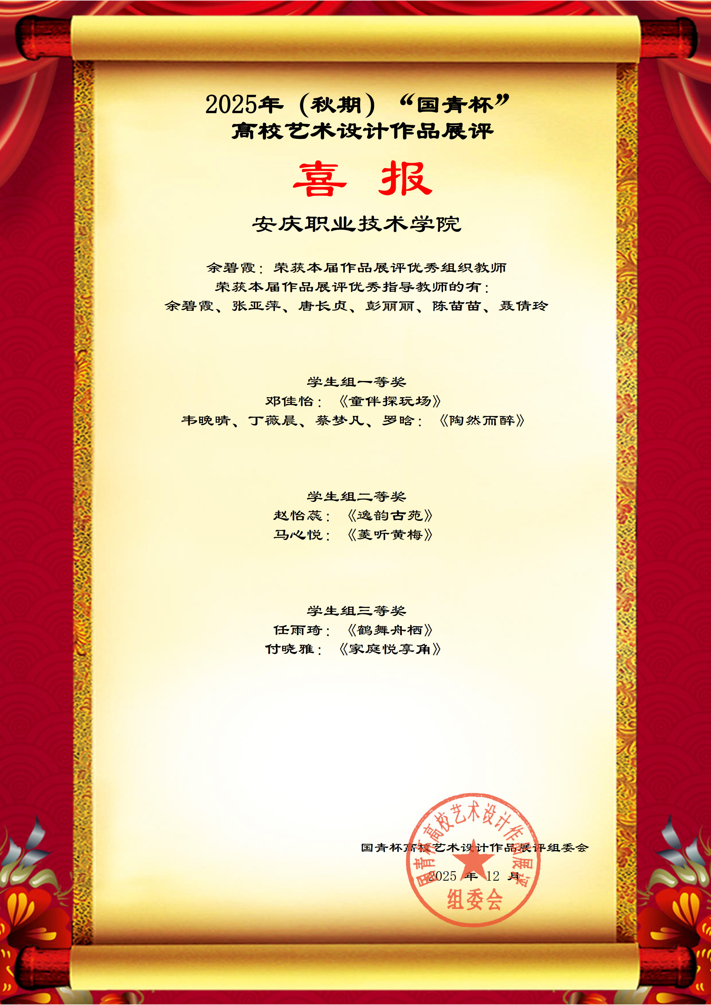 近日,2025年“國青杯”全國高校藝術(shù)設(shè)計作品展評活動結(jié)果揭曉,經(jīng)過安慶職業(yè)技術(shù)學(xué)院師生的共同努力,共有6件作品獲獎。